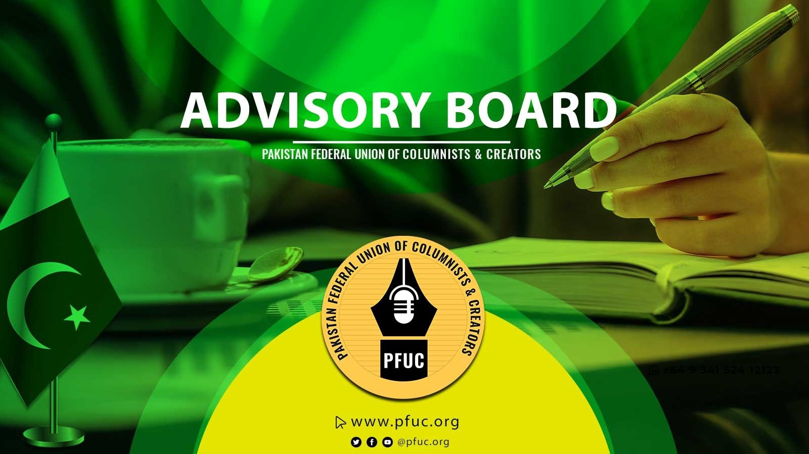 The Advisory Board of PFUC brings together seasoned journalists, senior columnists, and media experts who provide strategic guidance, mentorship, and insight to the union. Their collective experience ensures that PFUC maintains high standards of ethical journalism, professional integrity, and effective decision-making. By advising on key initiatives, policies, and regional coordination, the Advisory Board helps strengthen the voice of columnists and supports PFUC’s mission of fostering a credible, informed, and progressive media landscape across Pakistan.