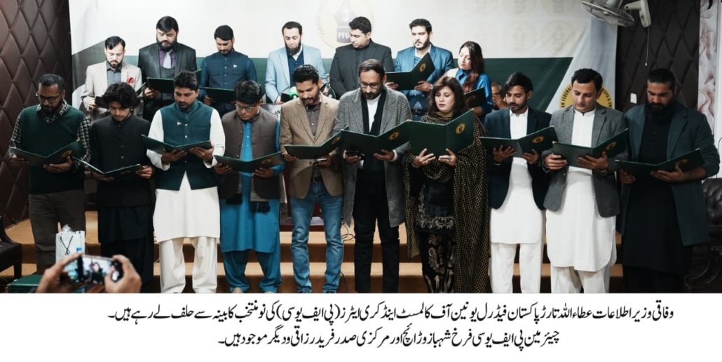 پی ایف یو سی کی تاریخی حلف برداری وفاقی وزیر عطا اللہ تارڑ نے پی ایف یو سی کی نو منتخب کابینہ سے حلف لے لیا؛ ریڈیو پاکستان سے متصل دفتر تنظیم کے لیے مختص کرنے کا بڑا اعلان